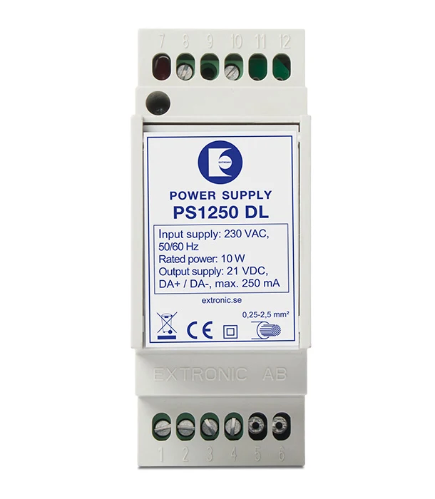 PS-1250DL är en DALI-drivare som kopplas till 230 VAC och strömförsörjer en DALI-slinga med 250 mA. Den har dubbla plintar för anslutning till DALI-slingan.